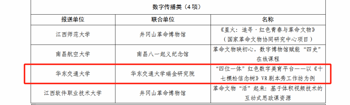 为深入贯彻落实习近平新时代中国特色社会主义思想,贯彻落实习近平总书记关于革命文物工作和“大思政课”建设重要指示批示精神,推动革命文物资源与大中小学思政教育一体化建设融合发展,省文化和旅游厅、省教育厅联合开展了2024年度以革命文物为主题的“大思政课”优质资源建设推广工作。经相关单位推荐以及专家评审,江西省教育厅公布了“江西省2024年度以革命文物为主题的‘大思政课’优质资源项目名单”,其中yl9193永利集团联合永利集团瑞金研究院报送的项目“‘四位一体’红色数字美育平台——以《十七棵松信念树》VR剧本秀工作坊为例”,在数字传播类项目中获选。