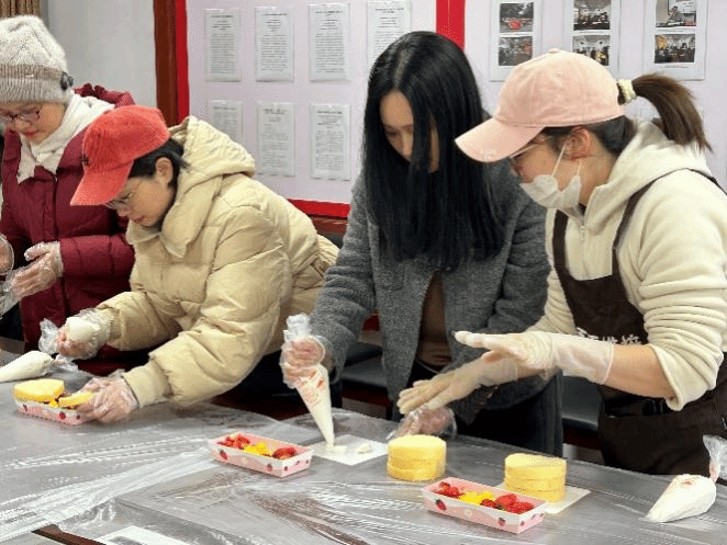 活动现场,蛋糕师傅从涂抹奶油果酱、摆放水果、装裱雕花等步骤一一进行了详细讲解。大家仔细聆听、认真琢磨,老师们边看边学,人人化身“糕点大师”制作各具特色的美味蛋糕,大家时不时地互相取经、分享制作小技巧。