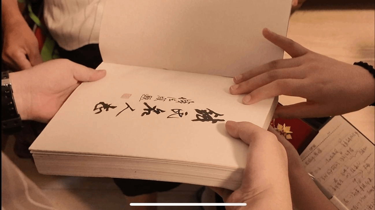 抗美援朝老兵钱万胜向实践队师生展示《钱氏名人志》