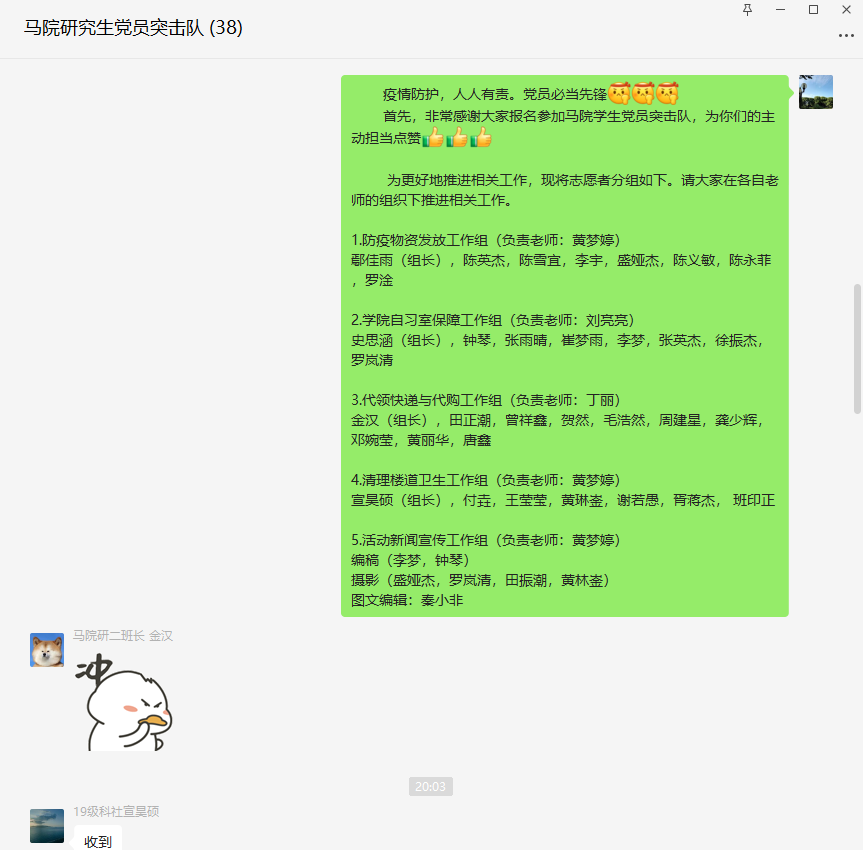 “昨晚是这座城市艰难的一晚,也是华交暖心的一夜,大家相信学校,做好防护,一切会好的。”这是3月18日许笑阳发在2个教学班级群中的一段话。学校进入封闭管理后,居家隔离的她第一时间在线上为同学们加油鼓劲。微信群里,一句句“稳住,我们能赢!”、一个个“奋斗”小表情汇聚成师生同心抗疫的坚强信心。