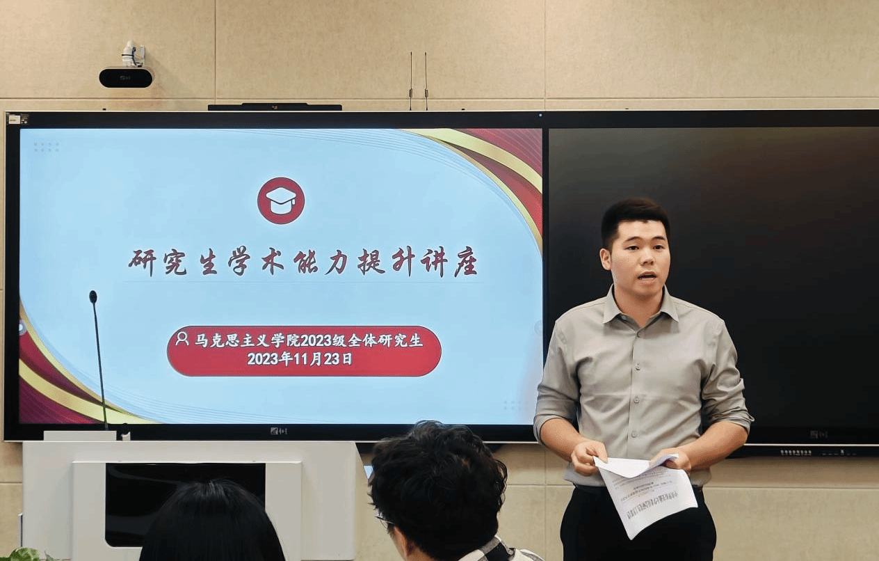 11月23日下午,2023级全体研究生学术沙龙研讨会在学院101会议室进行。吕承文对会前班级调研中同学们存在的问题做了精心准备,以“人文社会科学的四种技能”和“人类描述世界的三种语言”为切入点,结合个人实际经历重点讲述了读书的方法与技巧、选题的途径与思路、综述的写作与布局、演讲的态度与回应等四个方面。讲座中,吕老师旁征博引,学术气息与风趣幽默相结合的语言让现场气氛热烈,许远鹏分享了对此次学术研讨的学习感受,进一步引发同学积极思考。同学们纷纷表示收获颇丰,较好解决了目前存在的相关疑惑与迷茫,并表示持之以恒将所学方法运用到学习实践之中。