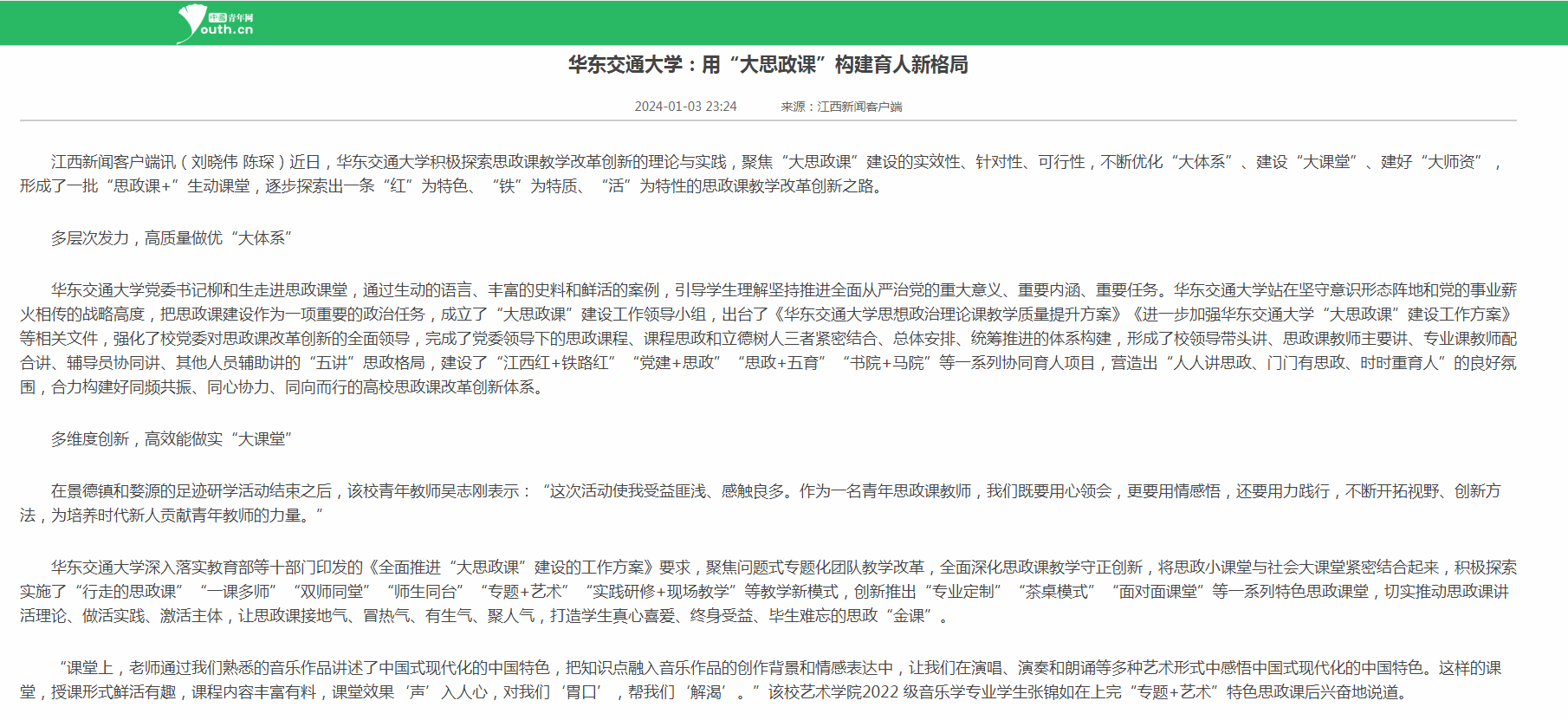 永利集团站在坚守意识形态阵地和党的事业薪火相传的战略高度,把思政课建设作为一项重要的政治任务,成立了“大思政课”建设工作领导小组,出台了《永利集团思想政治理论课教学质量提升方案》《进一步加强永利集团“大思政课”建设工作方案》等相关文件,强化了校党委对思政课改革创新的全面领导,完成了党委领导下的思政课程、课程思政和立德树人三者紧密结合、总体安排、统筹推进的体系构建,形成了校领导带头讲、思政课教师主要讲、专业课教师配合讲、辅导员协同讲、其他人员辅助讲的“五讲”思政格局,建设了“江西红+铁路红”“党建+思政”“思政+五育”“书院+马院”等一系列协同育人项目,营造出“人人讲思政、门门有思政、时时重育人”的良好氛围,合力构建好同频共振、同心协力、同向而行的高校思政课改革创新体系。