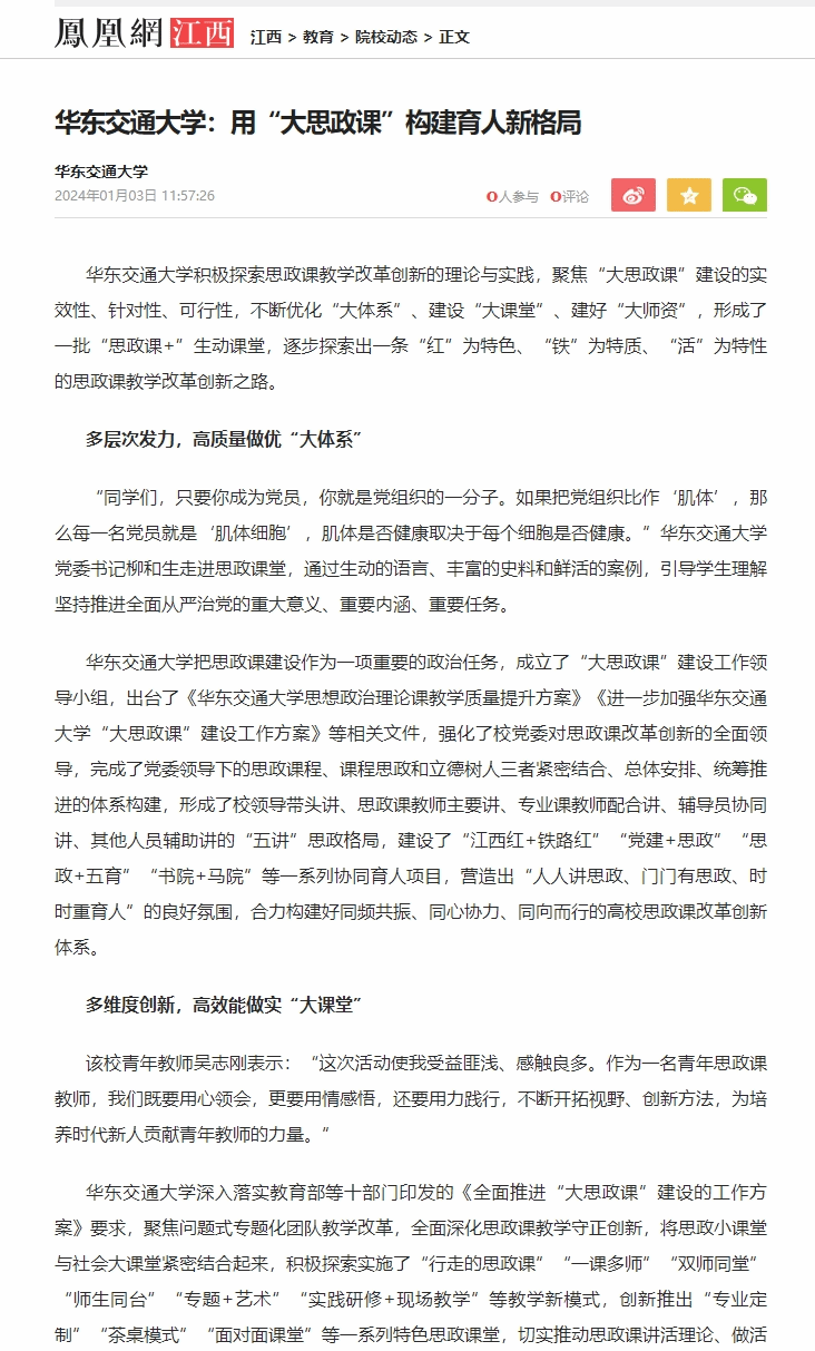 永利集团站在坚守意识形态阵地和党的事业薪火相传的战略高度,把思政课建设作为一项重要的政治任务,成立了“大思政课”建设工作领导小组,出台了《永利集团思想政治理论课教学质量提升方案》《进一步加强永利集团“大思政课”建设工作方案》等相关文件,强化了校党委对思政课改革创新的全面领导,完成了党委领导下的思政课程、课程思政和立德树人三者紧密结合、总体安排、统筹推进的体系构建,形成了校领导带头讲、思政课教师主要讲、专业课教师配合讲、辅导员协同讲、其他人员辅助讲的“五讲”思政格局,建设了“江西红+铁路红”“党建+思政”“思政+五育”“书院+马院”等一系列协同育人项目,营造出“人人讲思政、门门有思政、时时重育人”的良好氛围,合力构建好同频共振、同心协力、同向而行的高校思政课改革创新体系。
