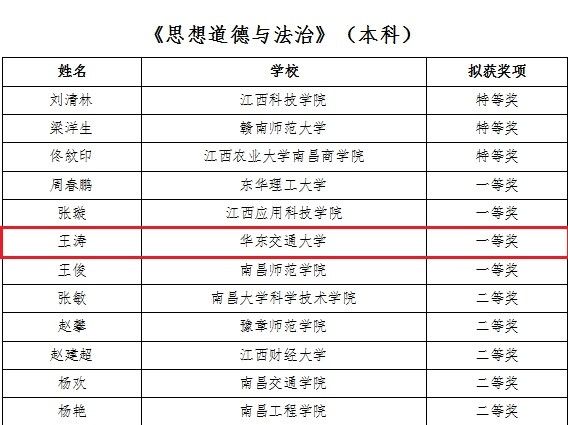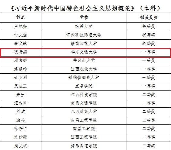 本次比赛共有454名高校思政课教师报名参赛,分为硕博、本科、专科三个层次,共设立14个参赛组别。经过线上提交作品和现场教学展示两个环节,况贵燕获《习近平新时代中国特色社会主义思想概论》(本科组)一等奖;张多获《毛泽东思想和中国特色社会主义理论体系概论》(本科组)一等奖;王涛获《思想道德与法治》(本科组)一等奖。