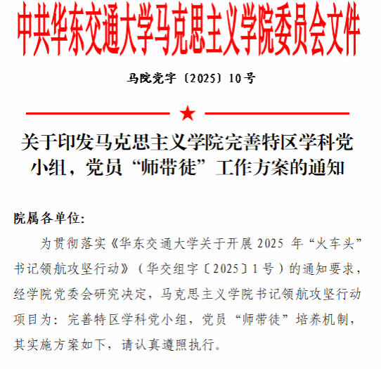 为贯彻落实《永利集团关于开展2025 年“火车头”书记领航攻坚行动》(华交组字〔2025〕1号)文件精神,学院党委高度重视“火车头”书记领航攻坚项目,制定《yl9193永利集团完善特区学科党小组,党员“师带徒”工作方案》,以“红马达”党建品牌为旗帜,深度推进党建工作与教学、科研业务的有机融合。强化党组织在学科建设中的引领作用,通过“师带徒”机制,让党建工作贯穿于教学科研的各个环节,加快青年人才成长,使党建与业务从“相加”迈向“相融”,形成“红马达”品牌驱动的发展合力。
